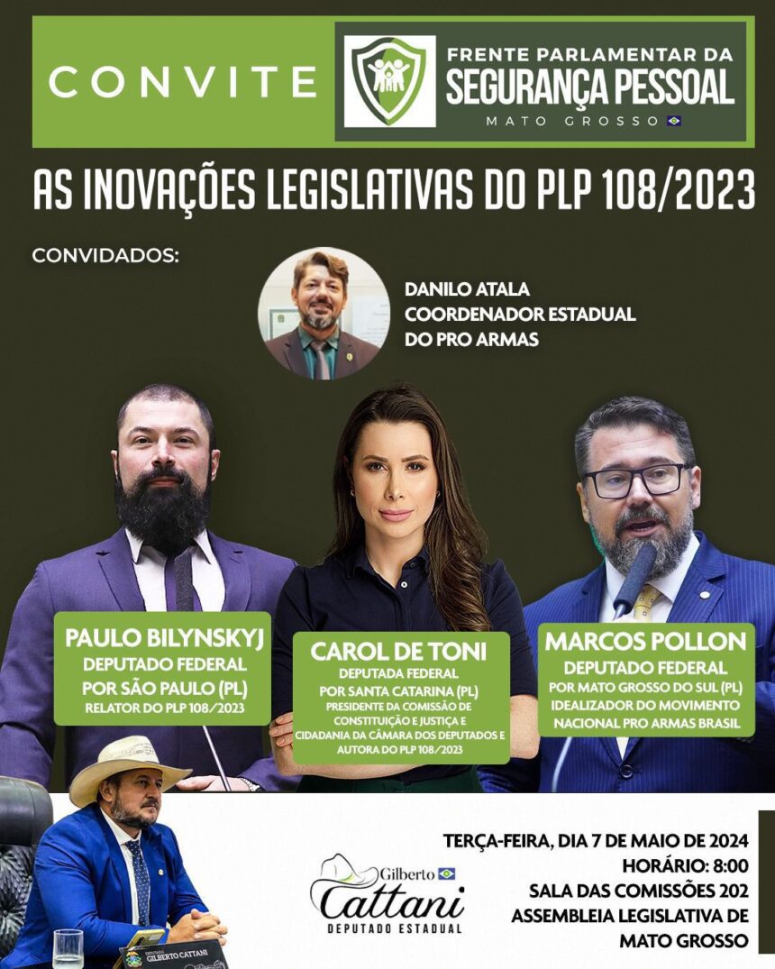 A Frente Parlamentar da Segurança Pessoal da Assembleia Legislativa de Mato Grosso vai debater, em reunião nesta terça-feira (7), as inovações do Projeto de Lei Complementar (PLP) 108/2023, que autoriza os estados e o Distrito Federal a legislarem sobre posse e o porte de armas de fogo.