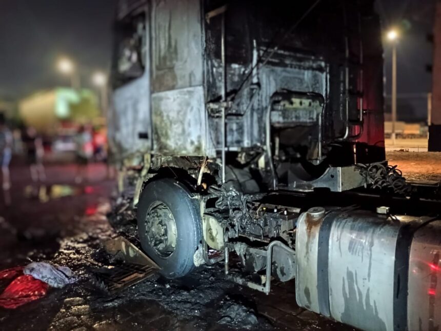 Veículos próximos ao caminhão tiveram que ser retirados por conta do risco de também serem incendiados.