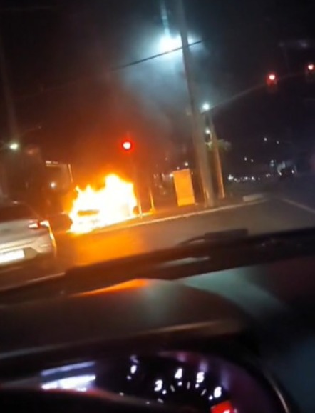 Imagens registradas por populares mostram o veículo em chamas, no meio da avenida, em um vídeo que circula pelas redes sociais.