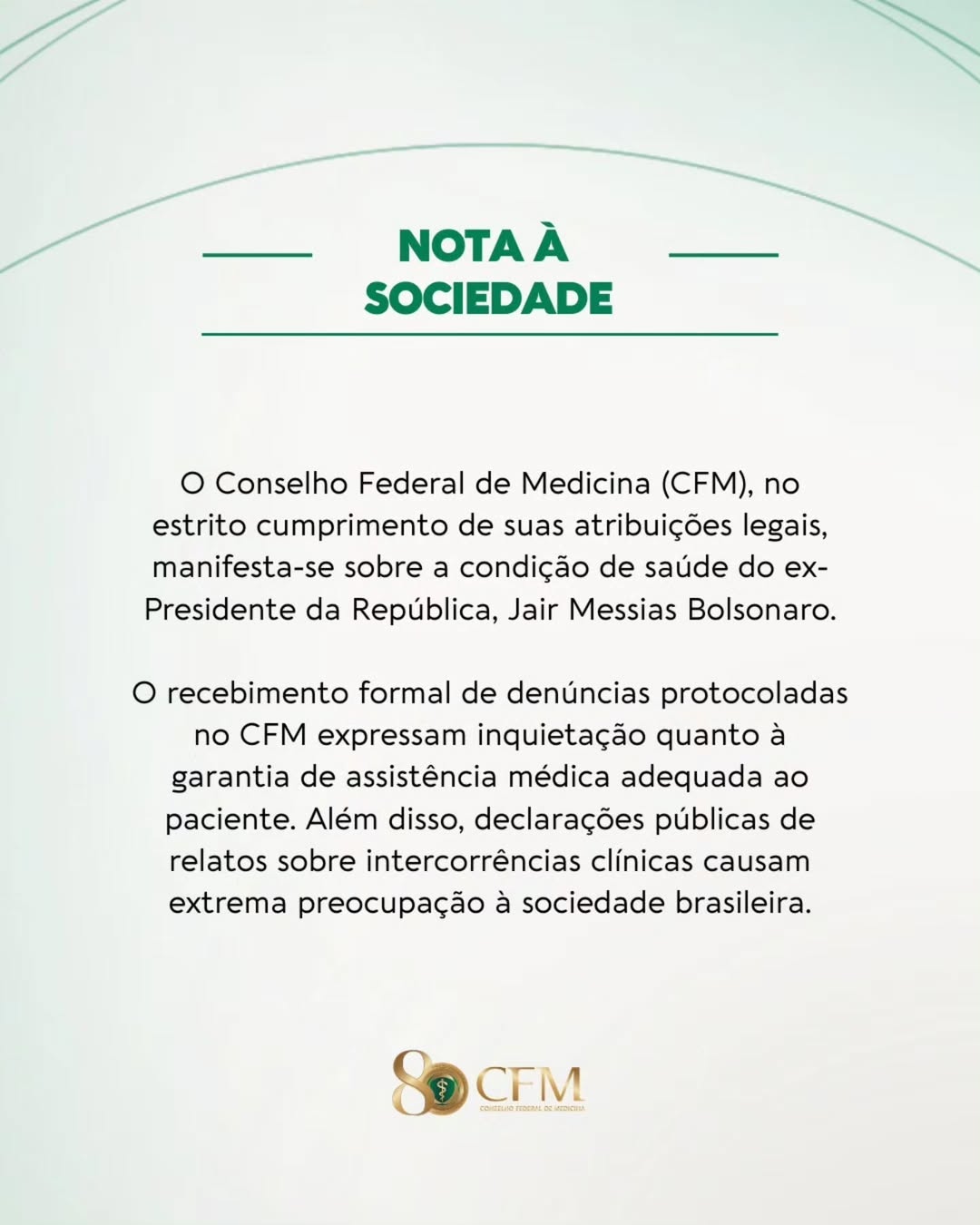 O Conselho Federal de Medicina (CFM) divulgou, nesta terça-feira (7), uma nota oficial à sociedade brasileira abordando a condição de saúde do ex-presidente da República Jair Messias Bolsonaro. No comunicado, o CFM informa ter recebido denúncias formais que apontam preocupações relacionadas à garantia de assistência médica adequada ao paciente, considerando seu histórico clínico e episódios recentes amplamente divulgados.