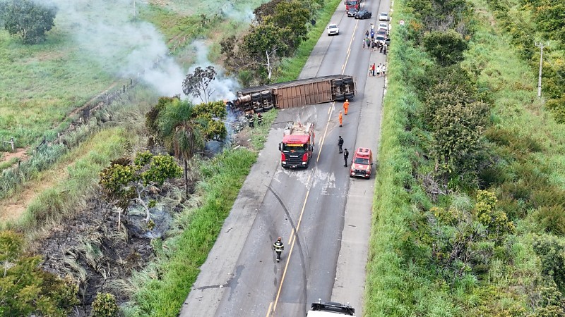 A carreta, por sua vez, teve a cabine consumida por um incêndio logo após o impacto. O fogo se alastrou rapidamente para a vegetação às margens da rodovia, exigindo uma operação de combate às chamas por parte dos bombeiros para evitar que o incêndio ganhasse proporções maiores.