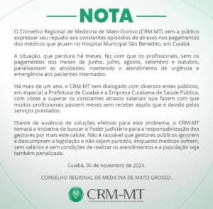 O Conselho Regional de Medicina de Mato Grosso (CRM-MT) vem a público expressar seu repúdio aos constantes episódios de atrasos nos pagamentos dos médicos que atuam no Hospital Municipal São Benedito, em Cuiabá.