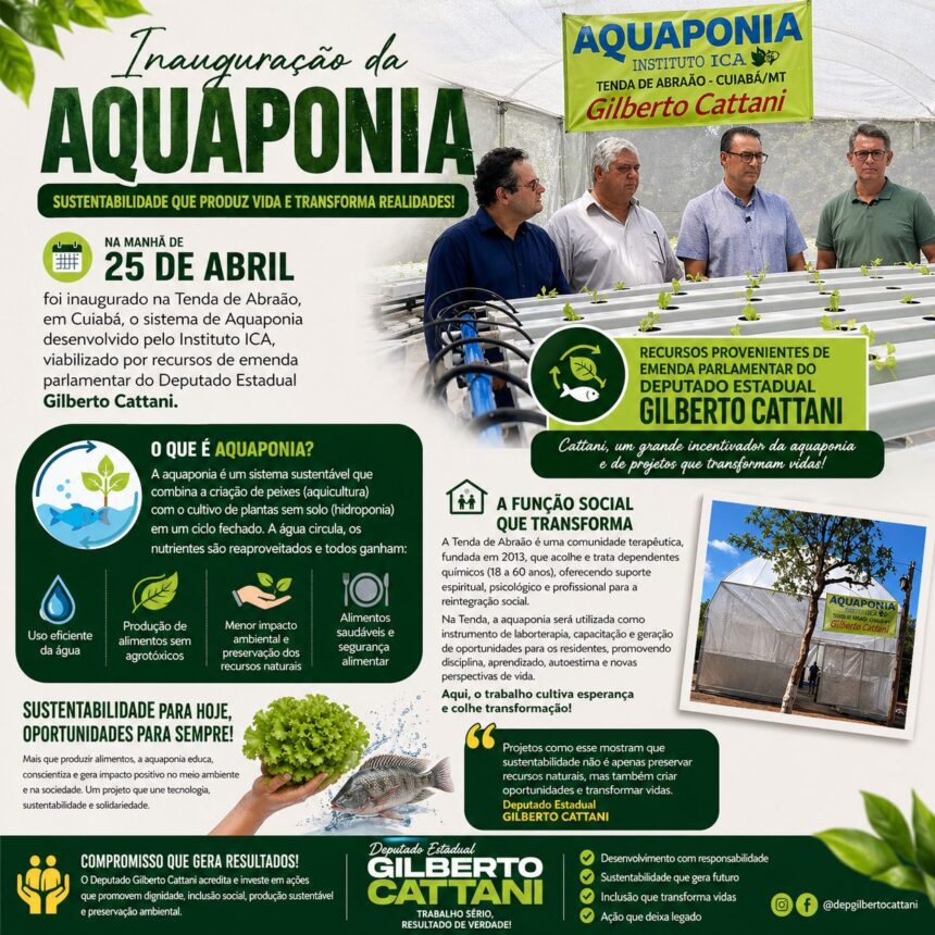 Foi inaugurado na última sexta-feira, dia 25 de abril, na comunidade terapêutica Tenda de Abraão, em Cuiabá, o sistema de Aquaponia desenvolvido pelo Instituto ICA, iniciativa viabilizada com recursos oriundos de emenda parlamentar do Deputado Estadual Gilberto Cattani, em mais uma ação voltada ao desenvolvimento social, sustentabilidade e valorização da vida.