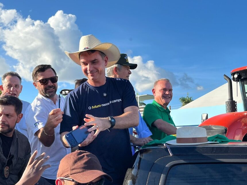 O senador e pré-candidato à Presidência da República, Flávio Bolsonaro (PL), desembarcou em Sinop na tarde da última quarta-feira, dia 22 de abril, para uma agenda intensa na feira Norte Show. Acompanhado de lideranças políticas estaduais, Flávio utilizou o palanque da Capital do Nortão para consolidar as pré-candidaturas do grupo em Mato Grosso e apresentar propostas agressivas de desburocratização ambiental e infraestrutura.