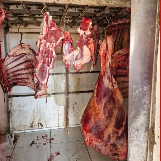 Ao entrarem no quintal da residência, os policiais encontraram um cenário alarmante. Havia restos de animais espalhados pelo chão, indícios de tentativas de queima para eliminar evidências e uma câmara fria em pleno funcionamento repleta de carcaças bovinas. Dentro da casa, sacos plásticos e carnes eram mantidos diretamente sobre o piso, sem qualquer condição de higiene.