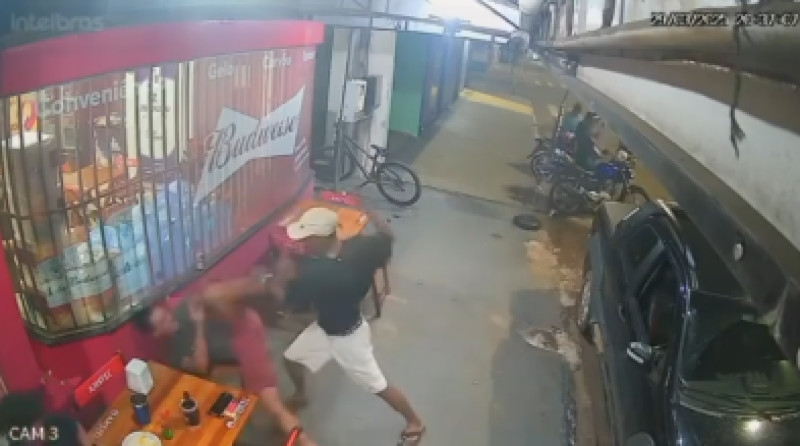 As imagens ainda mostram a vítima se levantando rapidamente e verificando se havia se ferido de forma grave. Ele foi atingido no abdômen e no braço esquerdo. O homem ferido ainda tenta sair do bar, quando o homem que o defendeu o leva para dentro do estabelecimento.