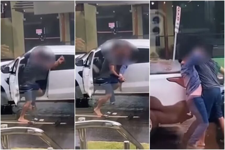 Após a batida, um dos motoristas desce do carro e vai em direção ao condutor do outro veículo. Os dois iniciam uma discussão que rapidamente se transforma em agressão. Em outro ângulo, filmado por testemunhas, é possível ver que o agressor está com uma faca na mão.
