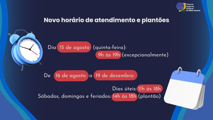 O Tribunal Regional Eleitoral de Mato Grosso, TRE-MT, vai estender o horário de atendimento ao público, nos dias úteis, e também passará a atender aos sábados, domingos e feriados, em regime de plantão.