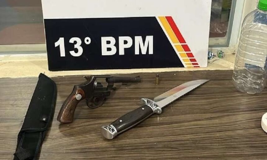 O comparsa, um rapaz de 20 anos, tentou se esconder da polícia, mas foi encontrado debaixo de uma carreta. Com ele a PM apreendeu faca e porções de maconha.