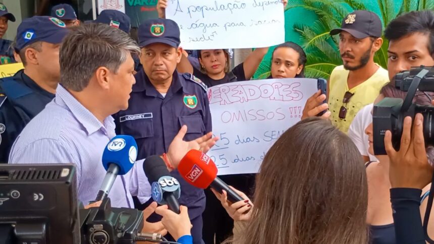 Moradores de diversos bairros de Várzea Grande realizaram uma manifestação em frente à prefeitura, cobrando soluções para a crise hídrica que afeta o Município.