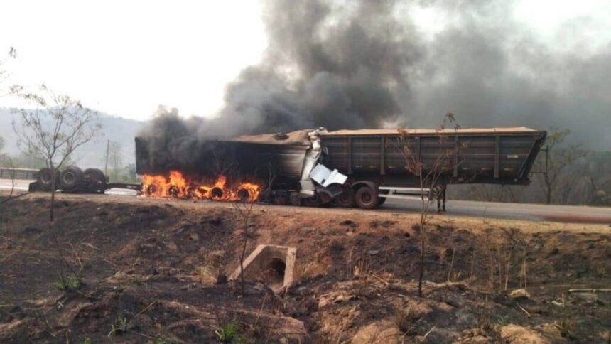 O veículo em que a vítima estava pegou fogo depois de uma colisão entre uma carreta. A vítima chegou a ficar presa às ferragens.