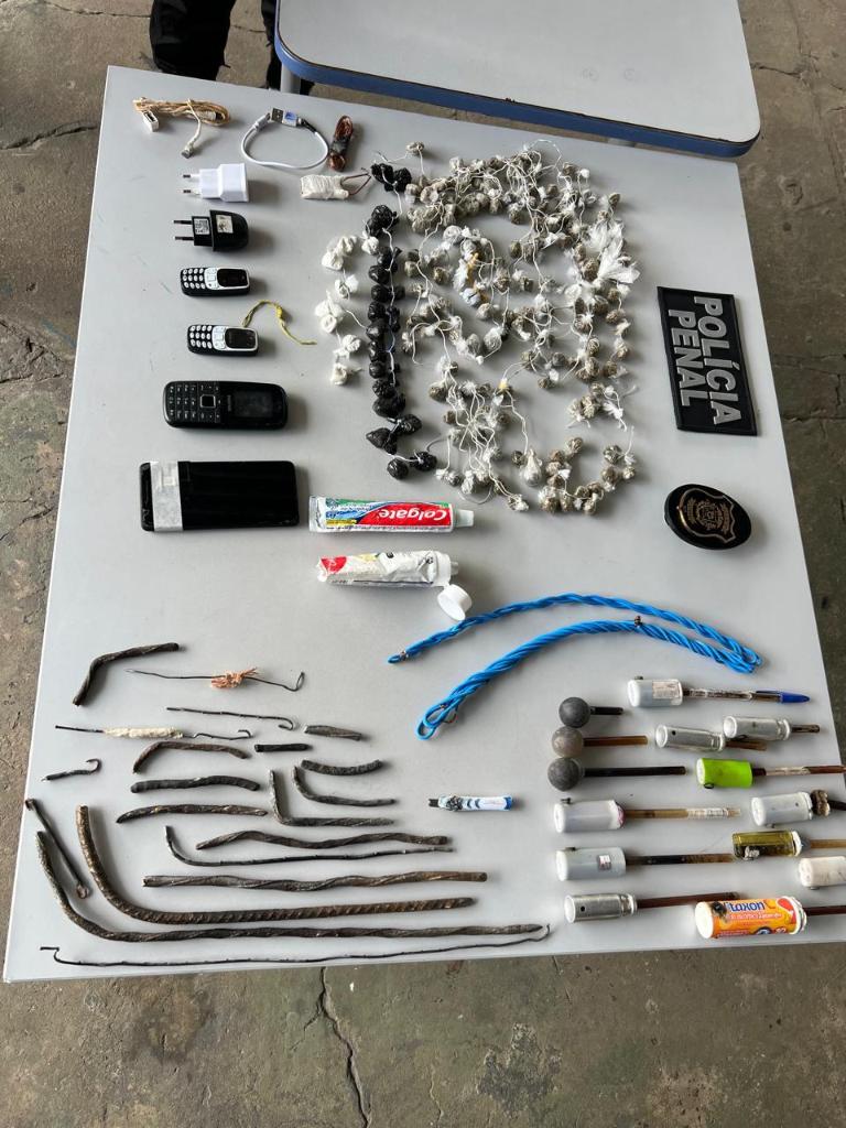 Foram apreendidos 49 carregadores, 35 armas artesanais (feitas com pedaços de ferro e madeira), 30 fones de ouvido e uma máquina de tatuar, entre outros produtos ilícitos, 400 gramas de porções de maconha e cocaína, além de 404 pequenas porções de drogas embaladas individualmente.