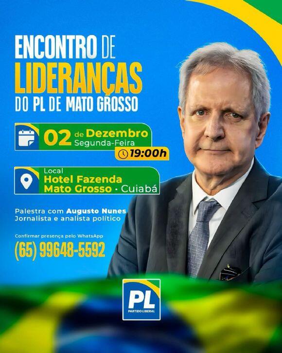 Na programação do encontro de hoje, está prevista a palestra do jornalista e analista político, Augusto Nunes. O senador Wellington Fagundes (PL), o deputado federal José Medeiros (PL) e o empresário Odílio Balbinotti também vão palestrar durante o evento.