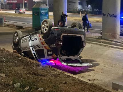 Um motociclista com uma criança na garupa entrou na frente da viatura da polícia na Avenida da FEB, em Várzea Grande, quando o policial para desviar dos dois e evitar uma batida, desviou rápido, só que acabou perdendo o controle do veículo e capotou.