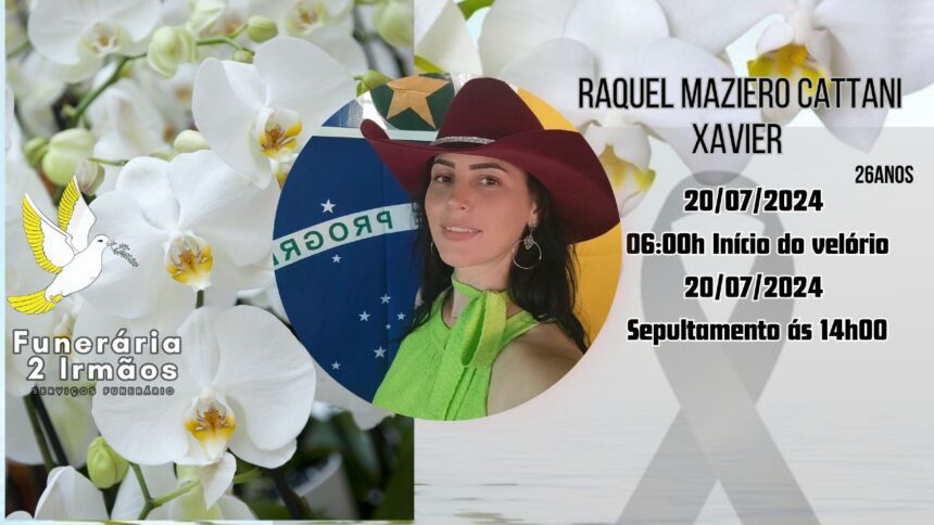 O corpo da produtora rural, Raquel Cattani, filha do deputado estadual Gilberto Cattani, está sendo velado na manhã deste sábado, dia 20 de julho, em Lucas do Rio Verde (MT). A previsão é de que o enterro ocorra ainda hoje, no período da tarde, às 14 horas.