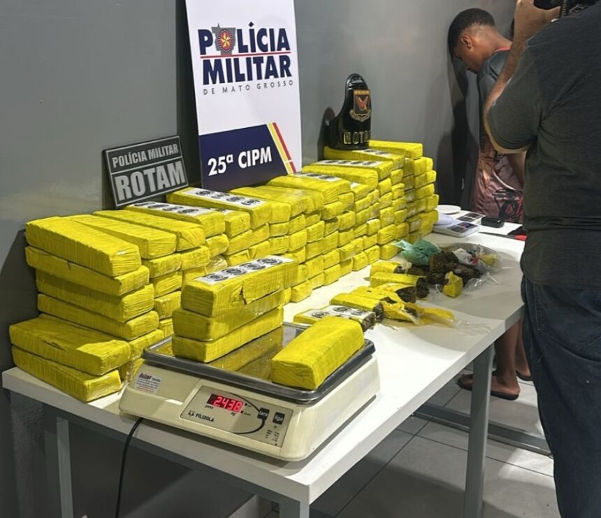 Na casa, foram encontrados 112 tabletes de maconha e outras nove porções grandes do mesmo entorpecente em um dos quartos. Foram apreendidos também quatro celulares e duas balanças de precisão.