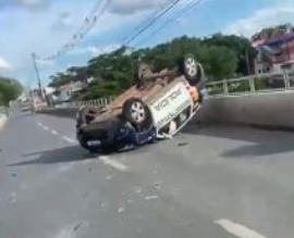 Viatura da PM capota na Ponte Nova após desviar de motociclista que causou acidente; VEJA VÍDEO